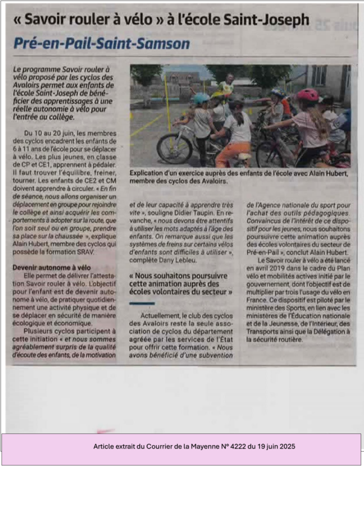 Chaque année, les Cyclos des Avaloirs proposent une action “Savoir rouler à vélo” dans un établissement scolaire du territoire intercommunal des Avaloirs. Formé et habilité par le ministère de l’Education Nationale à mener ce type d’opération, le club local se donne l’objectif d’apprendre aux enfants à maitriser un vélo, à se déplacer dans la circulation pour aller au collège et participe à ancrer chez tout un chacun les réflexes d’une mobilité décarbonée.